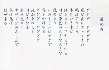 | かわのおと 1年 小田将士 どぼんぼくのおと ぱんぱんどぼん おにいちゃんのおと ぱんぱんぱんぱん ぱちんおとうさん のおと。 かわのうえをとびはね てくいしのおと。 ぼくもおとうさん みたいにかわの むこうまでとばし たいな。 (松阪市 第三小学校) |
